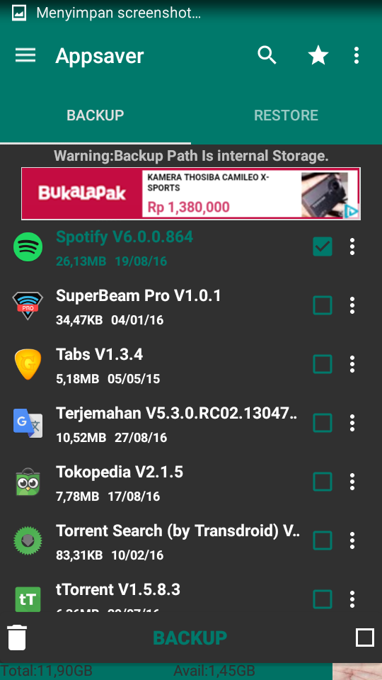 Masuk aplikasi appSaver, pada bagian tab Backup pilih aplikasi-aplkasi yang akan dijadikan file .apk dengan cara mencontreng pada sisi sebelah kanannya.